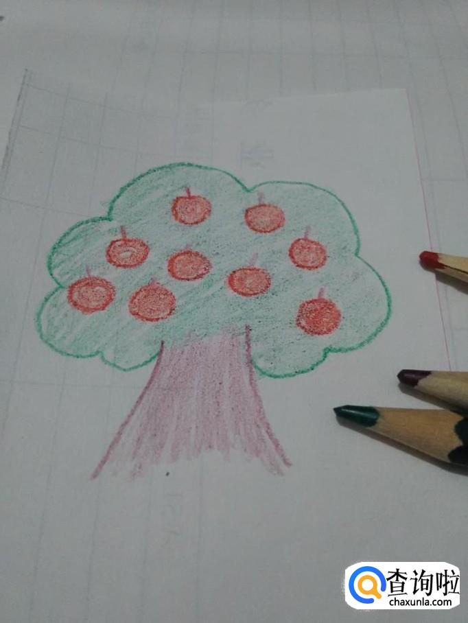 最后用棕色彩笔涂树干,用红色彩笔涂苹果,用绿色彩笔涂树冠,苹果树就画好了。