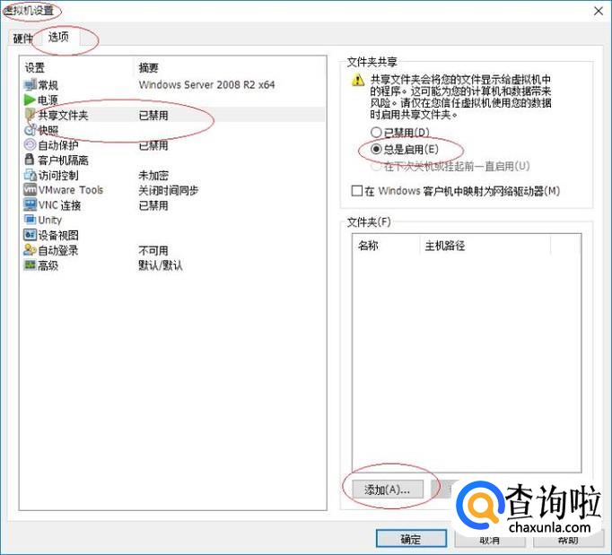 如图所示,选择"选项→共享文件夹"。点击"文件夹共享→总是启用"单选框,点击"文件夹→添加"按钮。