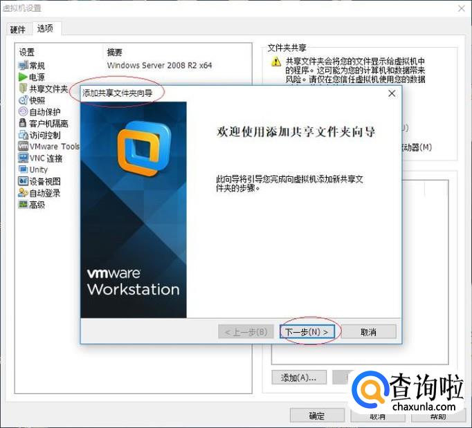 弹出"添加共享文件夹向导"对话框,如图所示。此向导用于向虚拟机添加共享文件夹,点击"下一步"按钮。