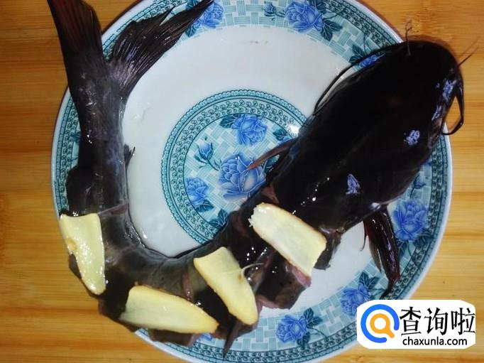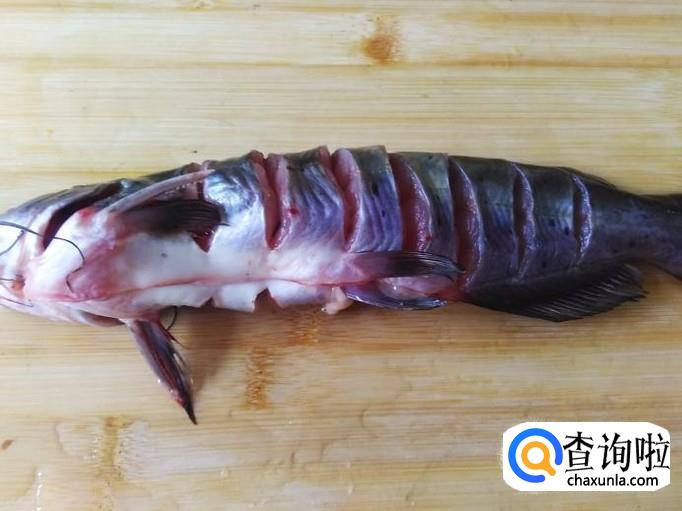 把骨鱼内脏清理干净,然后用刀在鱼身上均匀地划痕。