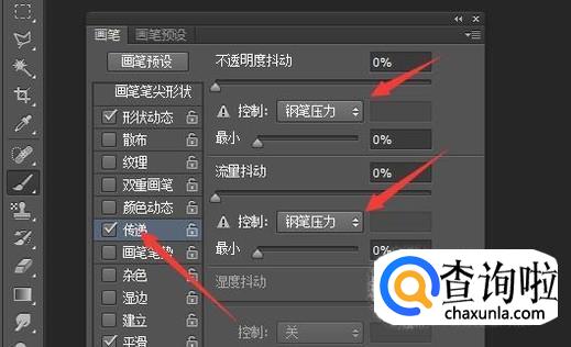 再勾选传递,在不透明度抖动下方的控制处选择钢笔压力,在流量抖动下方的控制处同样选择钢笔压力。