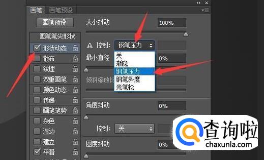 在画笔控制面板中勾选形状动态,将大小抖动调为0,在下方的控制处选择钢笔压力。