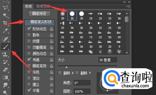 弹出画笔的控制面板,在左侧工具栏处选中画笔工具。在画笔控制面板中点击画笔笔尖形状,再选择一款圆形画笔。