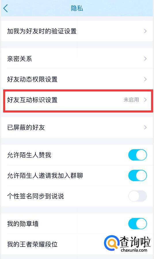 在隐私界面就能看到“好友互动标识设置”(如下图所示,现在是未启用状态,所以导致互动标识消失),我们点击进入它。