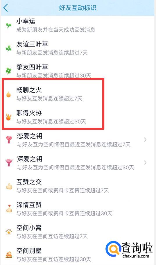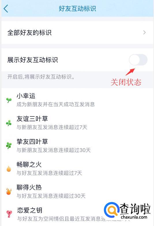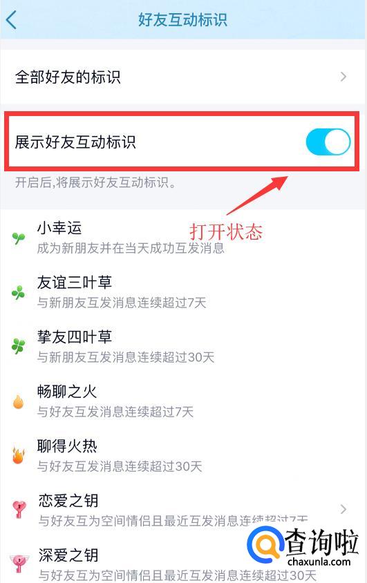 将“展示好友互动标识”开关打开即可。这样就可以显示出来好友互动的火花标识了。