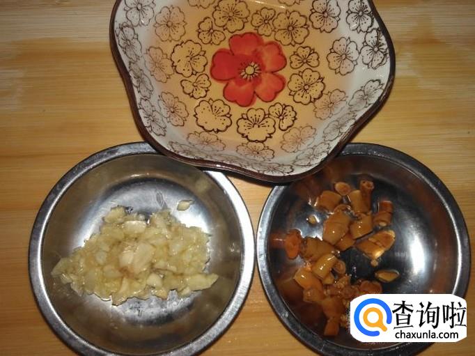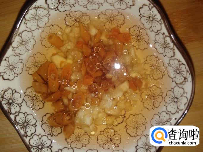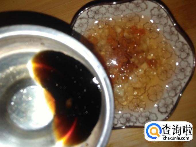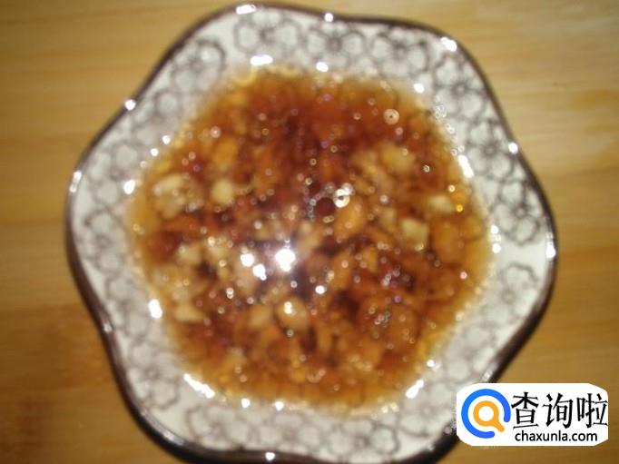 把蒜蓉、泡椒倒进酸梅醋里,加1勺生抽搅拌均匀。