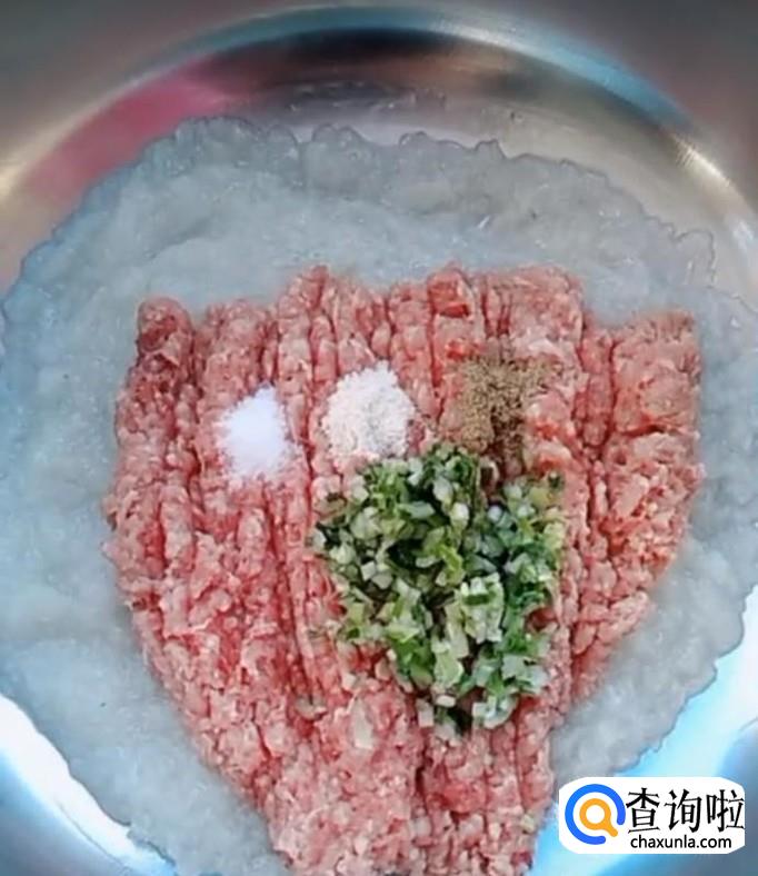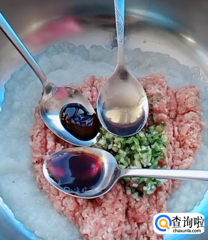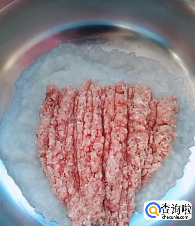 蒸熟的山药出锅,用勺子压成泥,放适量猪肉馅儿。