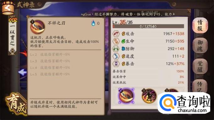 作为SSR式神妖刀姬一直都是热门式神,首先我们先来了解下这个式神的面板属性。妖刀姬的速度攻击暴击都是S,其中最为突出的是基础暴击为12%大多数式神纵使是SSR往往暴击率只有10%,由此可见妖刀姬的输出爆发非常高,但是防御就差了点。