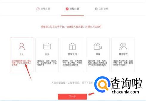 填写完手机验证码后,选择注册类型,如果是个人注册的话,就点击“个人”,然后点击“下一步”。注册东方号,只要把资料填写完整,一般是可以通过的。