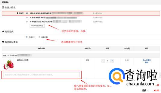 确认订单信息,主要包括收获地址,收货人姓名,电话,右边,所选商品的数量,单价,运送方式等,如果对商品有特别的要求可以给卖家留言。