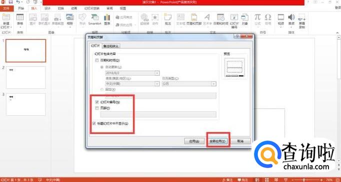 在此窗口底部,有“幻灯片编号”和“标题幻灯片中不显示”,在两个选项前的方框内打钩,再点击全部应用。
