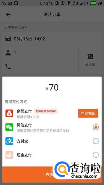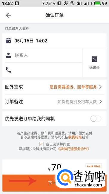如果是立即搬家的话,点击“现在用车”进入确认订单界面,确认个人信息,点击“下一步”。