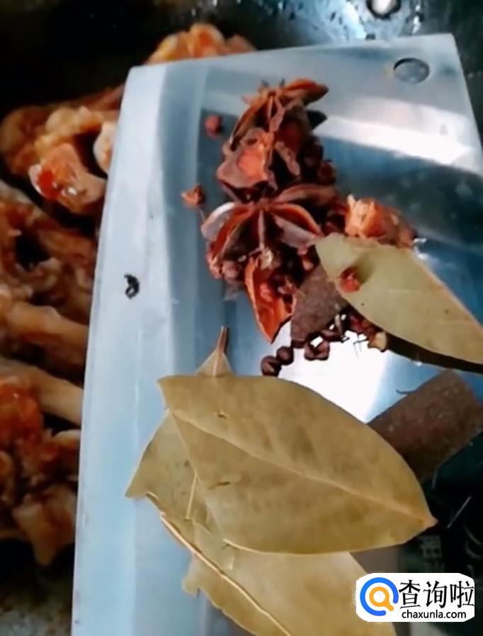 接着我们再放入花椒,大料,香叶,桂皮,倒入适量的清水,刚刚没过猪蹄即可