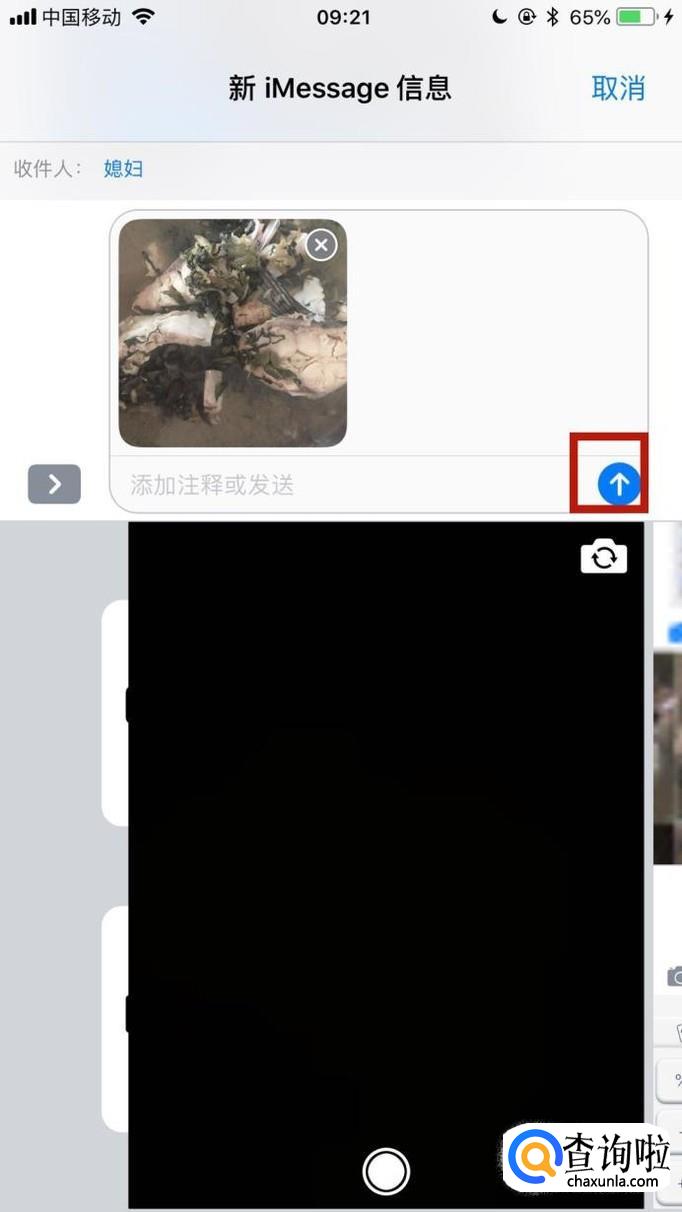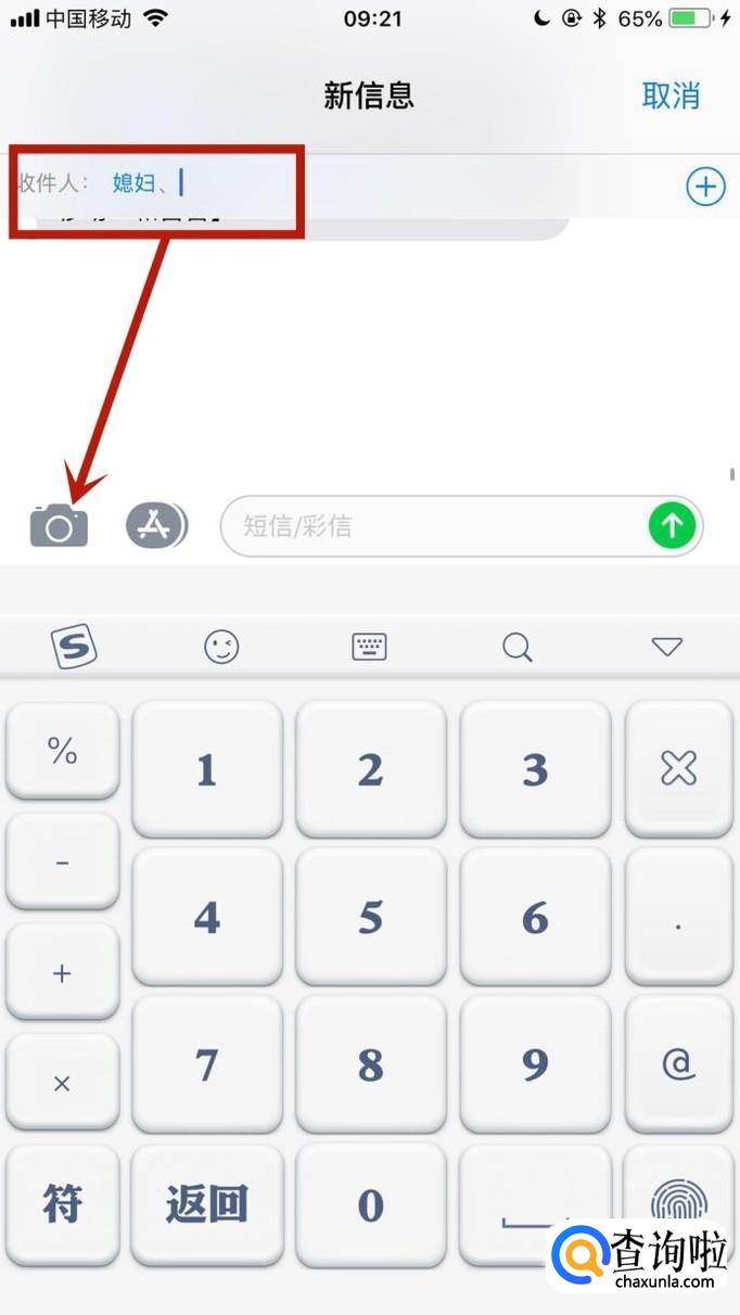 接着输入收件人姓名并点击屏幕下方的相机图标,如下图所示。