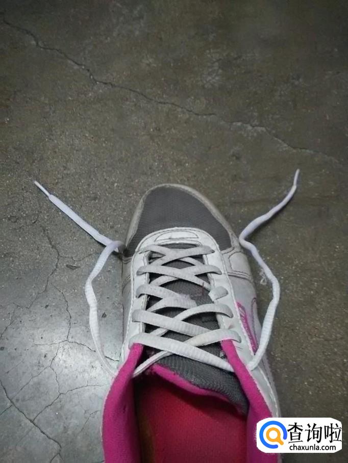 先把两侧的鞋带交叉打个普通的结,打好后,鞋带头依然在鞋的两端。