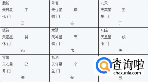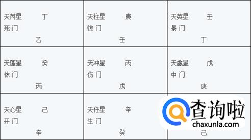 根据九星的排列再在九星现在的落宫内排出九星原来附带的地盘奇、仪,标在地盘奇、仪的上面,这就是天盘干。天蓬星原属坎宫,坎宫现在的地盘干是癸,所以就将癸落在天蓬星所在的震宫,此时震宫内天盘干是癸地盘干是丙。天英星原属的离宫现在地盘是壬,那么就将壬落在天英星现在所在的坤宫,其他以此类推。