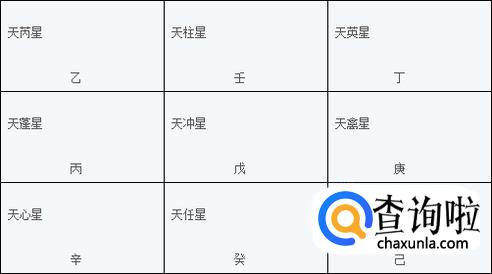 排九星,时干支是丙辰为甲寅旬那么癸所落之宫内原属的星为值符星,今癸落坎宫所以值符星为天蓬星,同时休门为值使门。值符星必须和时干同宫,现在时干丙落震三宫,所以此时天蓬星也就落在震三宫,然后按照九宫顺序顺排其他星。