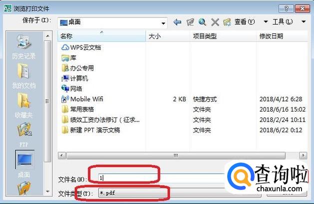 弹出“浏览打印文件”选项框,就是选定位置保存图形,比如说我命名为该打印文件为“1”,默认文件类型就是PDF(因为设置了打印机是PDF),点击保存。