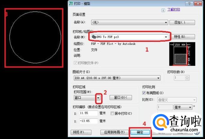 在“打印模型”中,如图所示按照步骤操作,先选择打印机名称为“DWG To PDF”,然后在打印范围设置中用窗口模式,并在图中选中范围,最后点击确定(还可以进行居中设置、比例设置等,根据个人需要)。