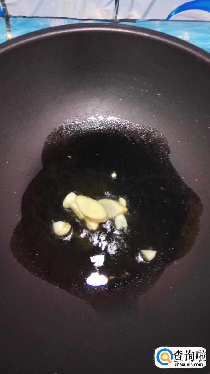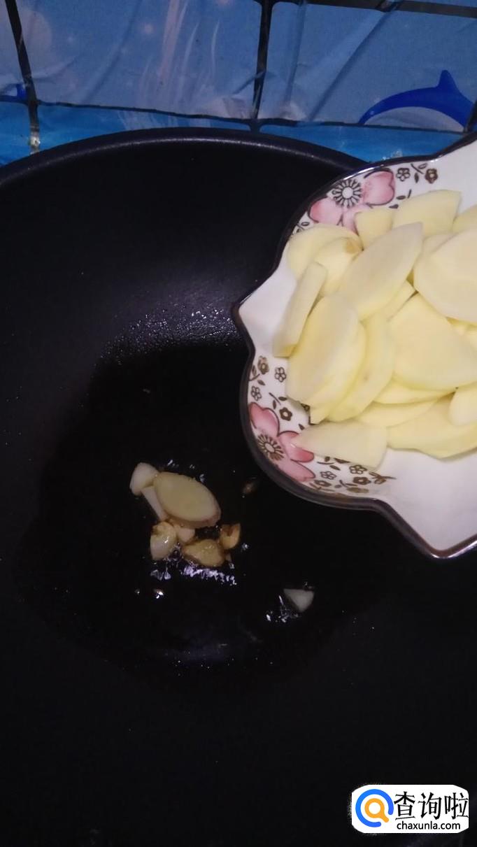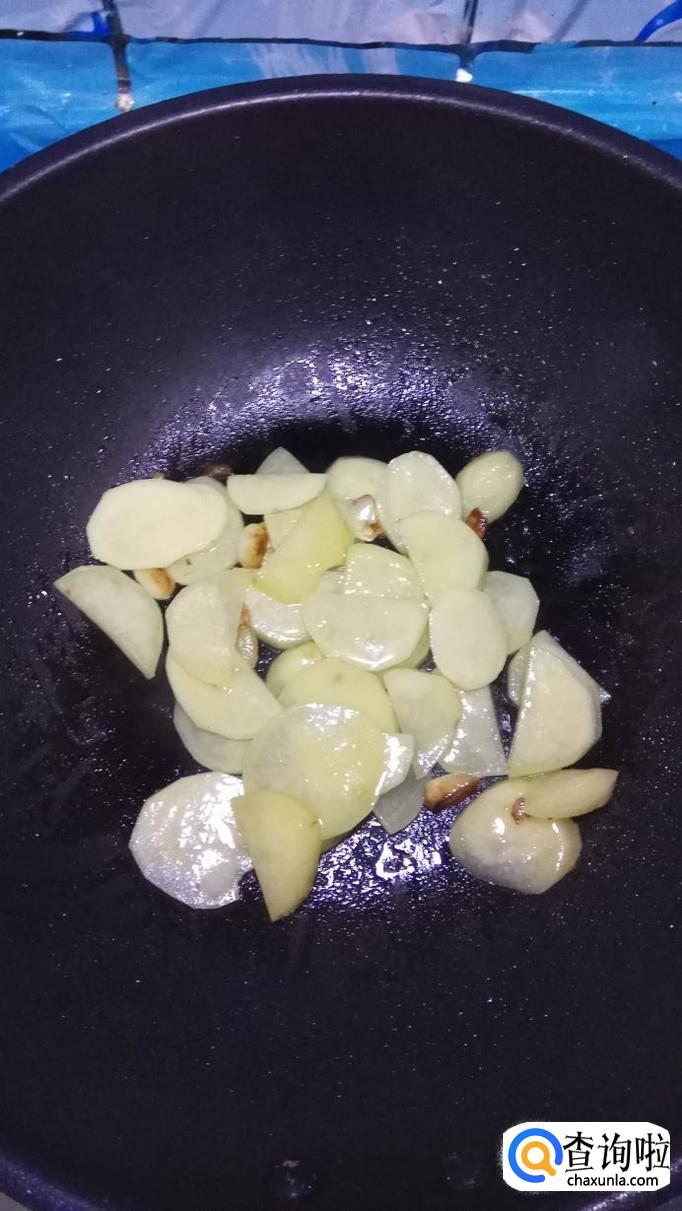 炒锅中放入适量油,油热后放入蒜片,姜片爆香,然后将土豆片放入锅中翻炒,小火慢炒,炒至土豆变色。