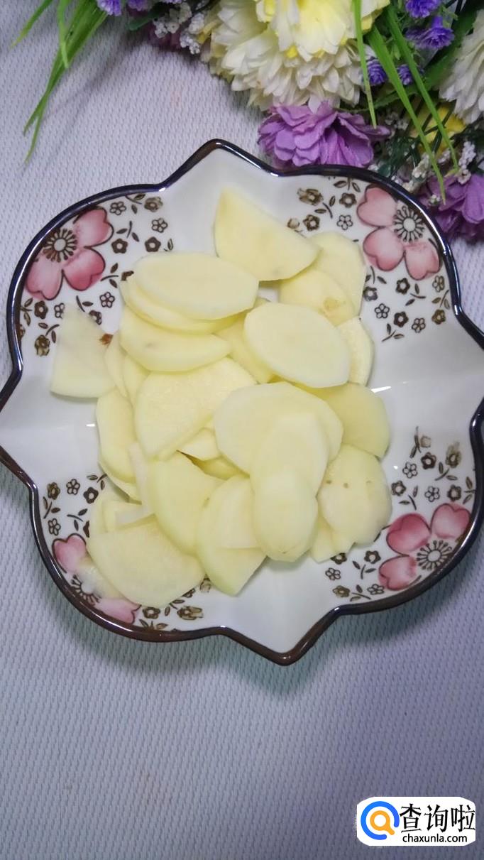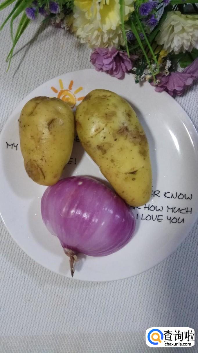 准备两个小土豆,洗净去皮,切成片,将土豆片洗去淀粉,放入盘中备用,再准备半个洋葱,将洋葱剥去外皮备用。