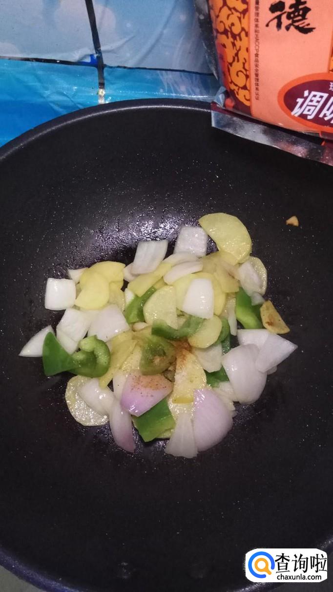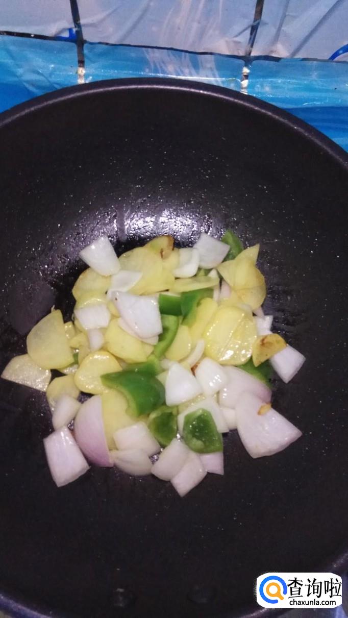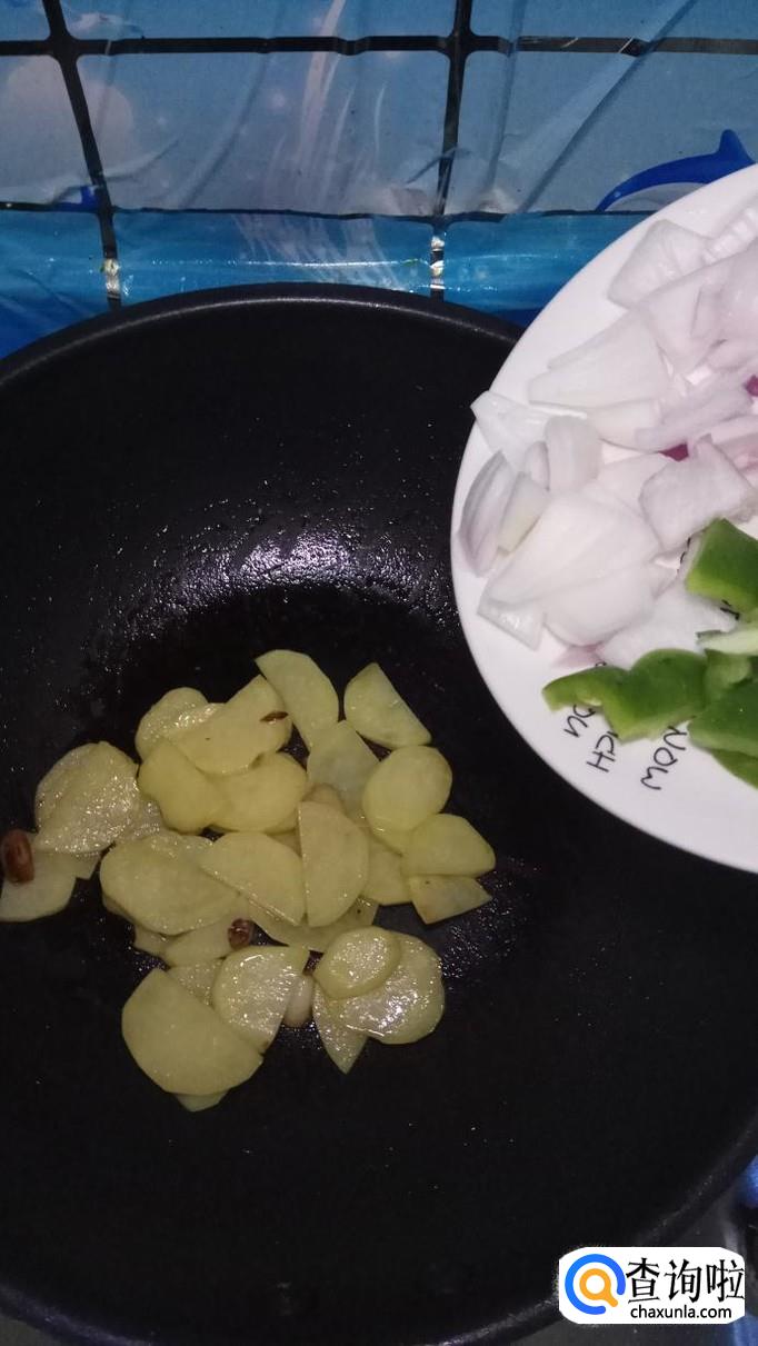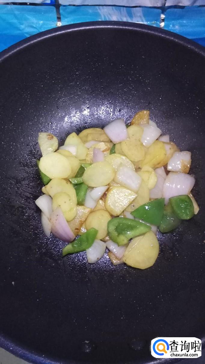 然后将青椒片和洋葱片放入锅中,和土豆片一起翻炒,青椒和洋葱比较容易熟,所以后放。