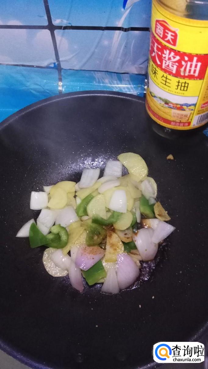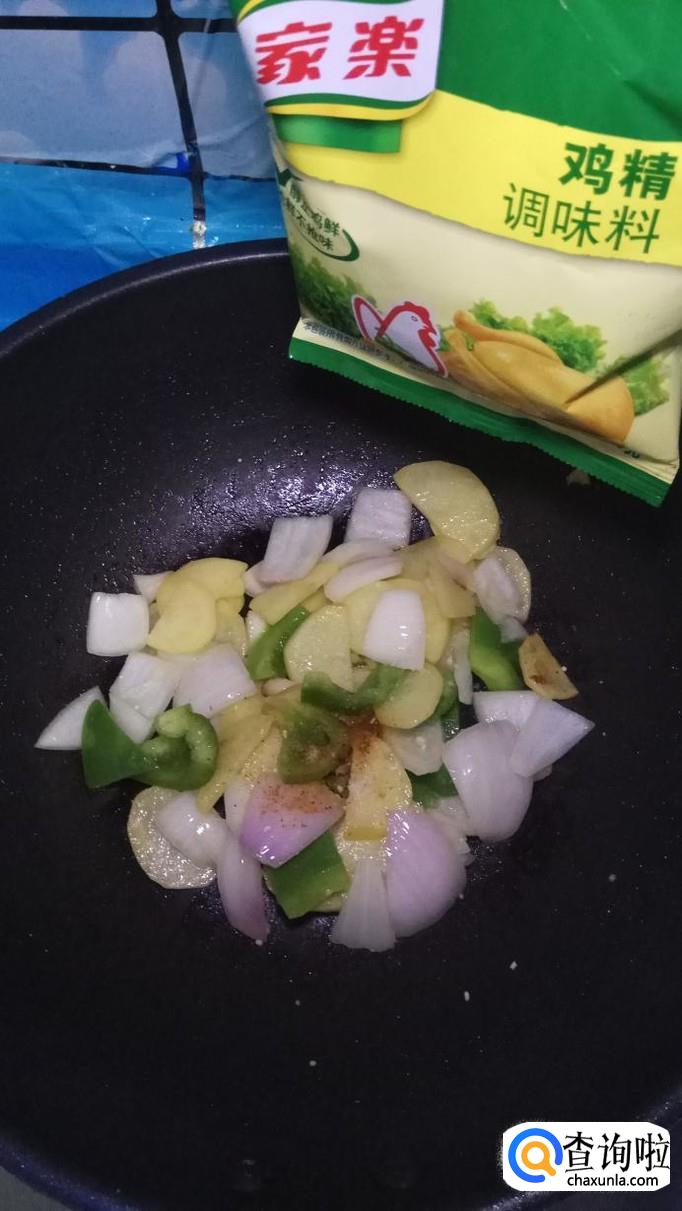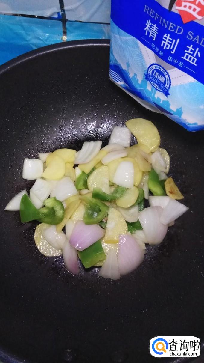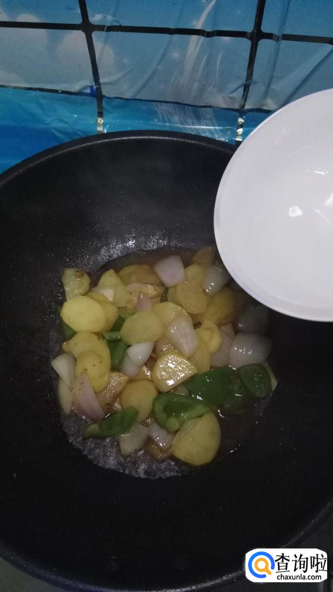 然后将青椒片和洋葱片放入锅中,和土豆片一起翻炒,青椒和洋葱比较容易熟,所以后放。