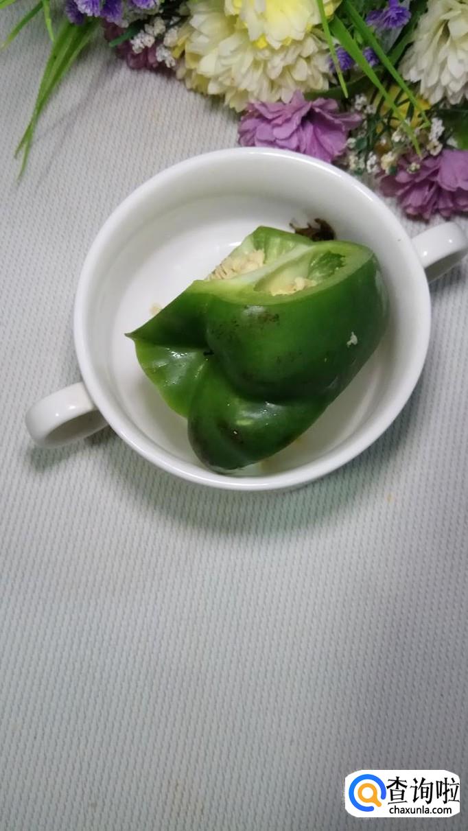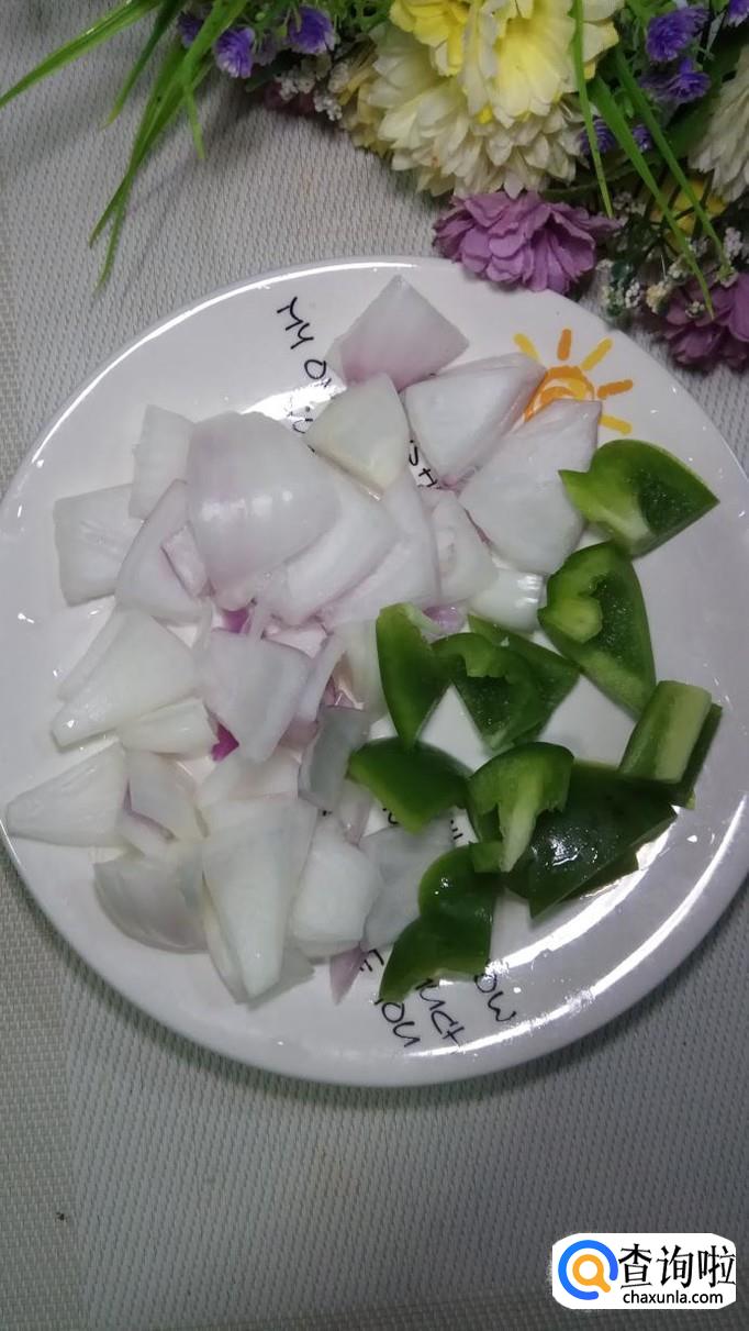将洋葱洗净后切成片。再准备少量青椒,将青椒,洗净后切成块儿,和洋葱放在一起备用。