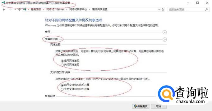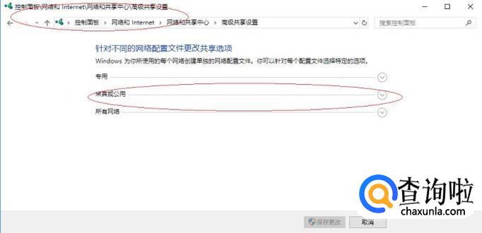 如图所示,唤出"高级共享设置"选择界面。点击"来宾或公用"右侧向下箭头,针对不同的网络配置文件更改共享选项。