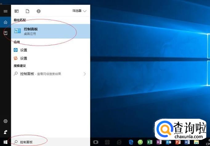 如图所示,搜索框输入"控制面板"。Cortana(小娜)显示搜索结果,点击"最佳匹配→控制面板"项。