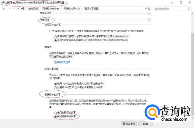 勾选"密码保护的共享→关闭密码保护共享"单选框,如图所示。本例到此结束,希望对大家能有所帮助。