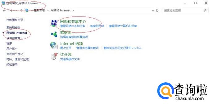 如图所示,唤出"网络和Internet"选项界面。点击右侧"网络和共享中心"图标,用于查看网络状态、更改网络设置。