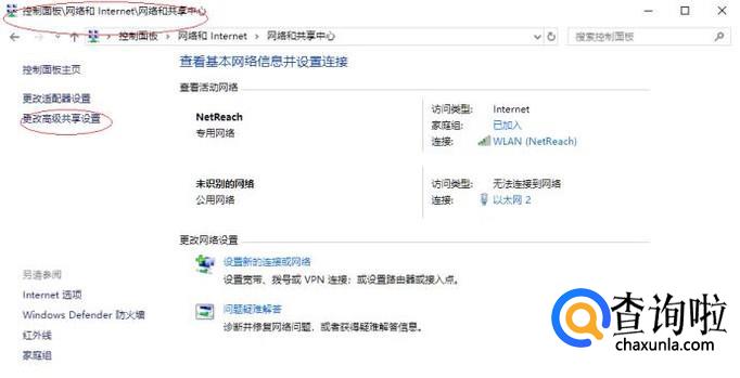 唤出"网络和共享中心"选项界面,如图所示。点击左侧"更改高级共享设置"图标,下步将进行排除局域网计算机无法访问共享文件夹的故障。