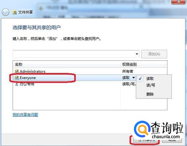 然后点击选中“everyone”,点击“共享”。