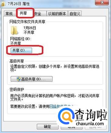 在文件夹属性选项框中,点击“共享”标签,再点击“共享”按钮,如图所示。