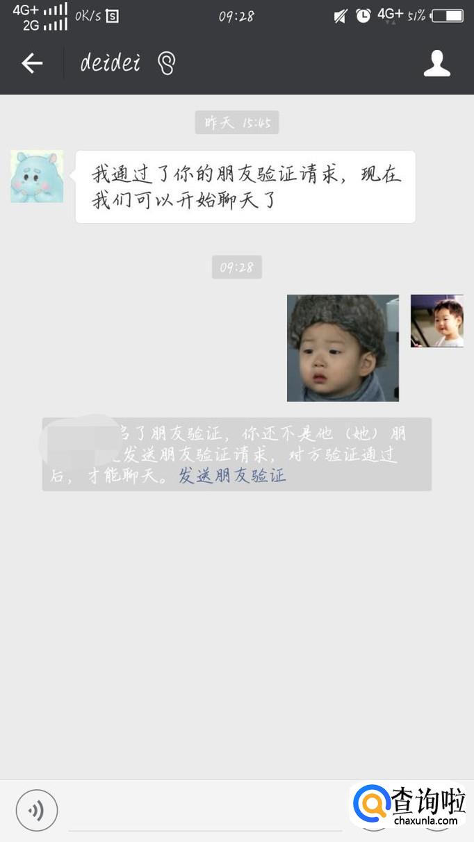 会出现对方验证后才能聊天的消息提示,那对方就是把你删除好友了。继续发消息在你发出的消息前出现红色感叹号。如图所示
