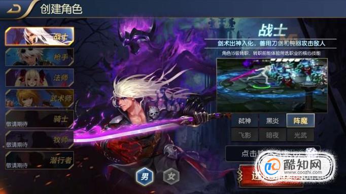 游戏目前有四个职业可供选择:战士、抢手、法师、武术师;