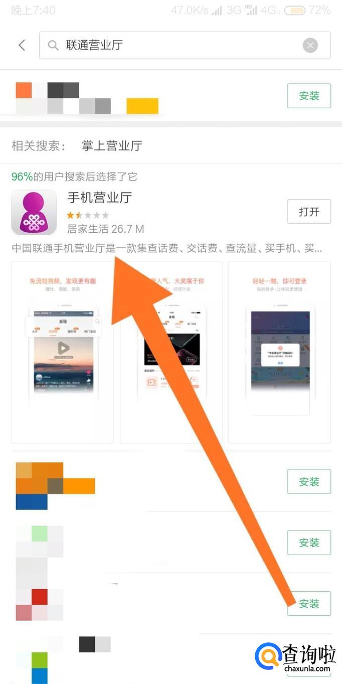 首先在手机的应用商店里下载安装联通官方的手机营业厅软件,并打开该软件。