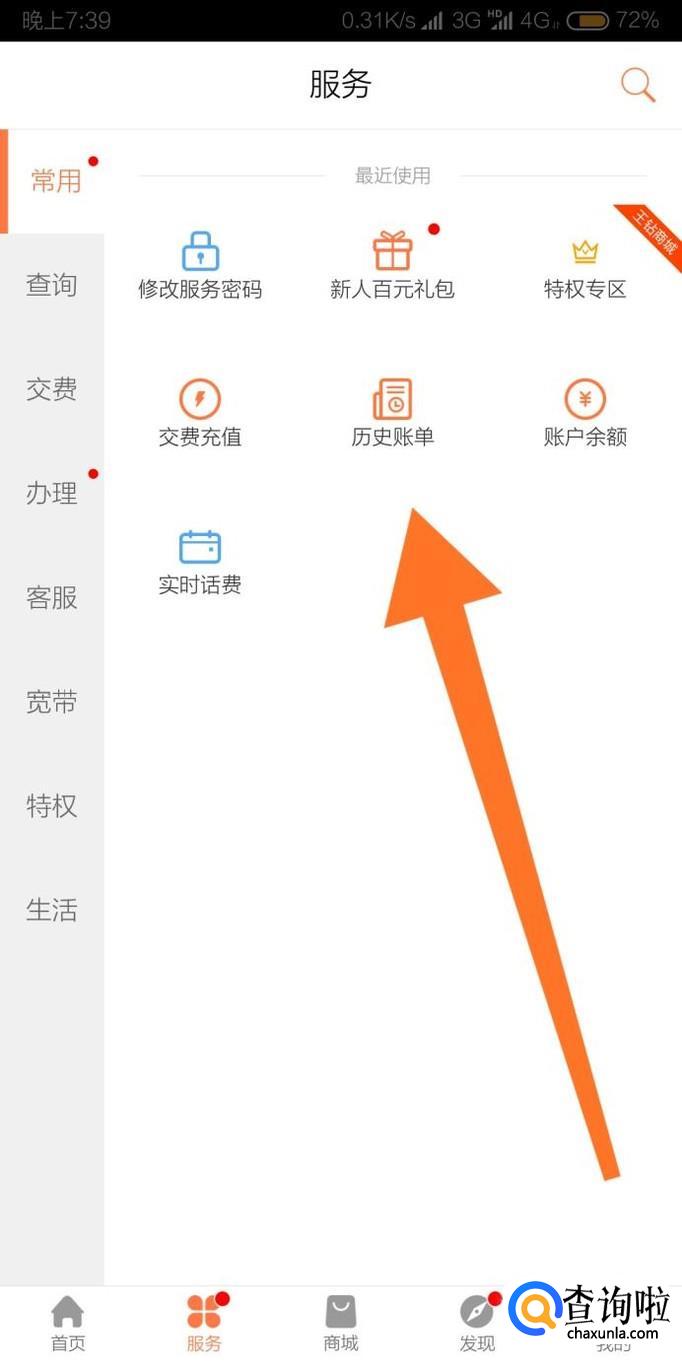 点击“常用”服务界面下的“历史账单”字样即可查询到手机卡的历史消费记录。
