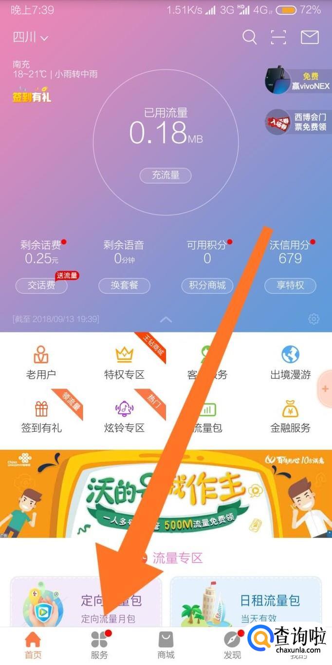 进入联通手机营业厅后,点击软件界面底部导航栏的“服务”字样。