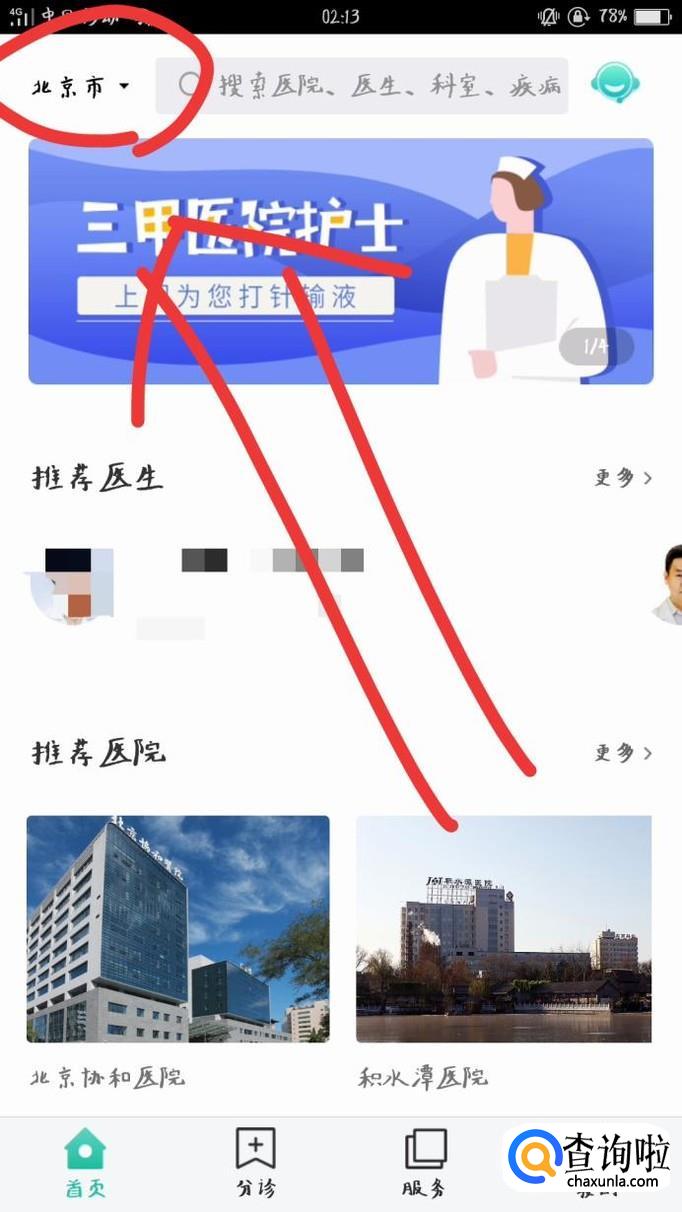进入软件首页,在屏幕左上角可选择需要挂号医院所在的地区,如下图。