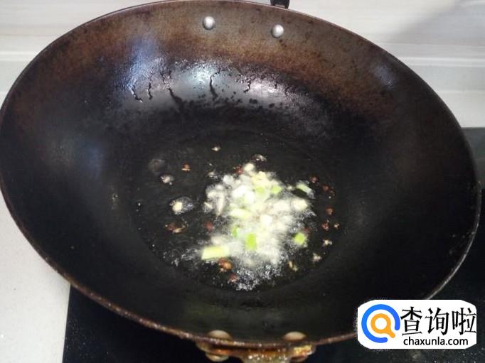 锅内放入油加热,油热后放入花椒爆锅,然后放入葱,姜,蒜(留一部分蒜末待用),翻炒出香味。