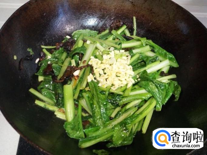 榛蘑翻炒两分钟即可。放入一匙儿耗油,随即放入小白菜,大火爆炒。炒至小白菜断生,放入味精。放入留用的一部分蒜末,关火出勺。