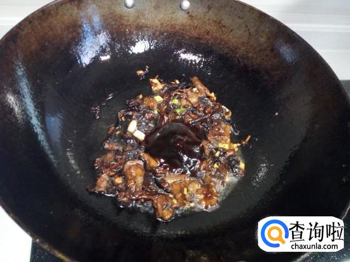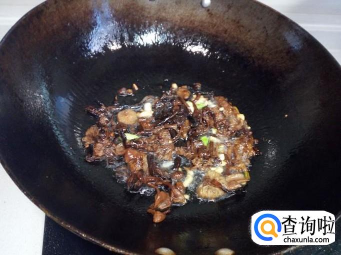 放入榛蘑翻炒,放入料酒,少许酱油,盐。