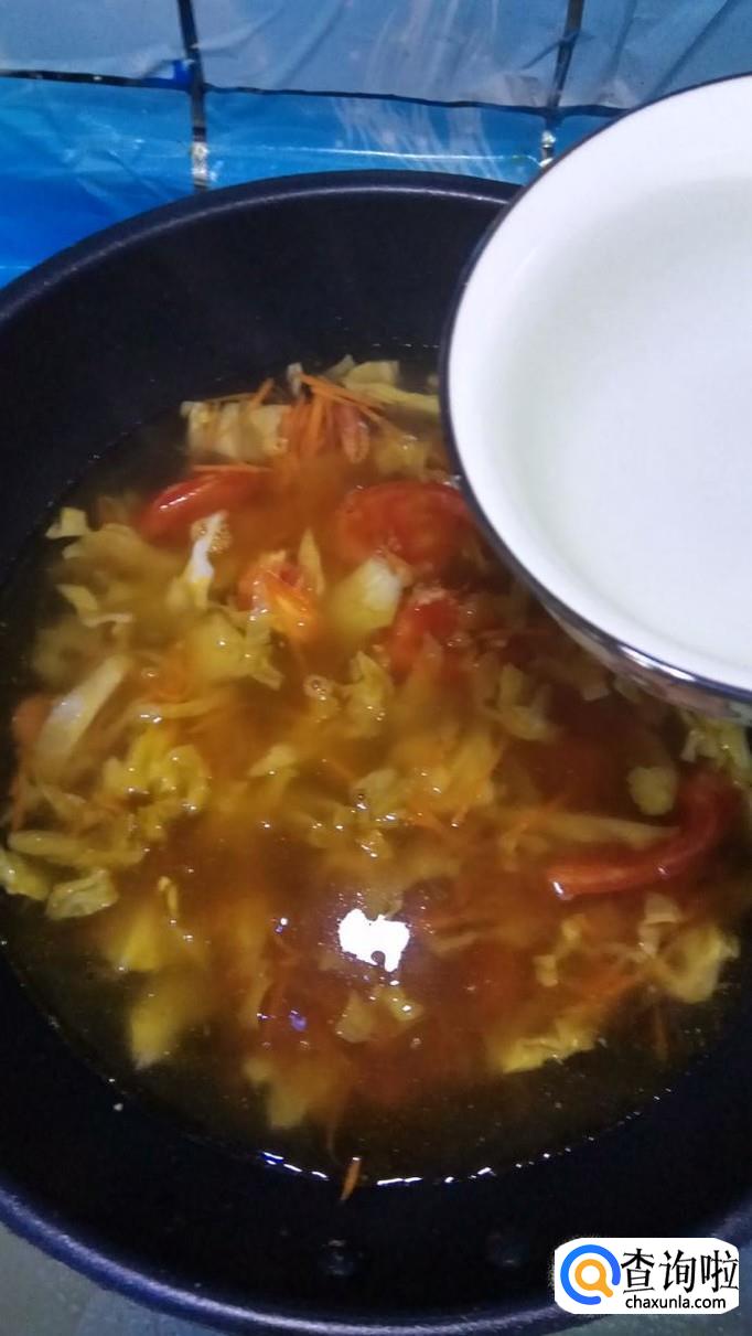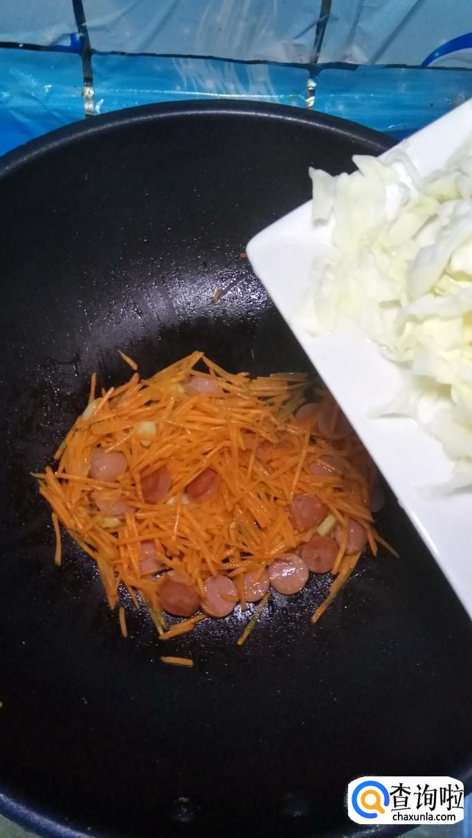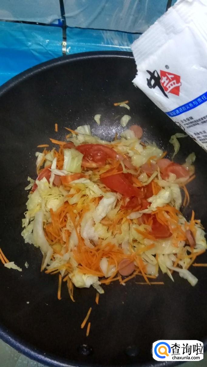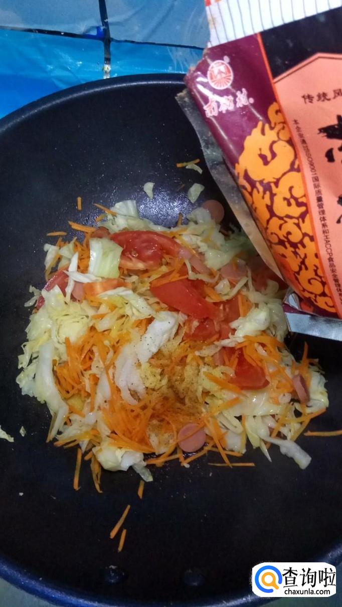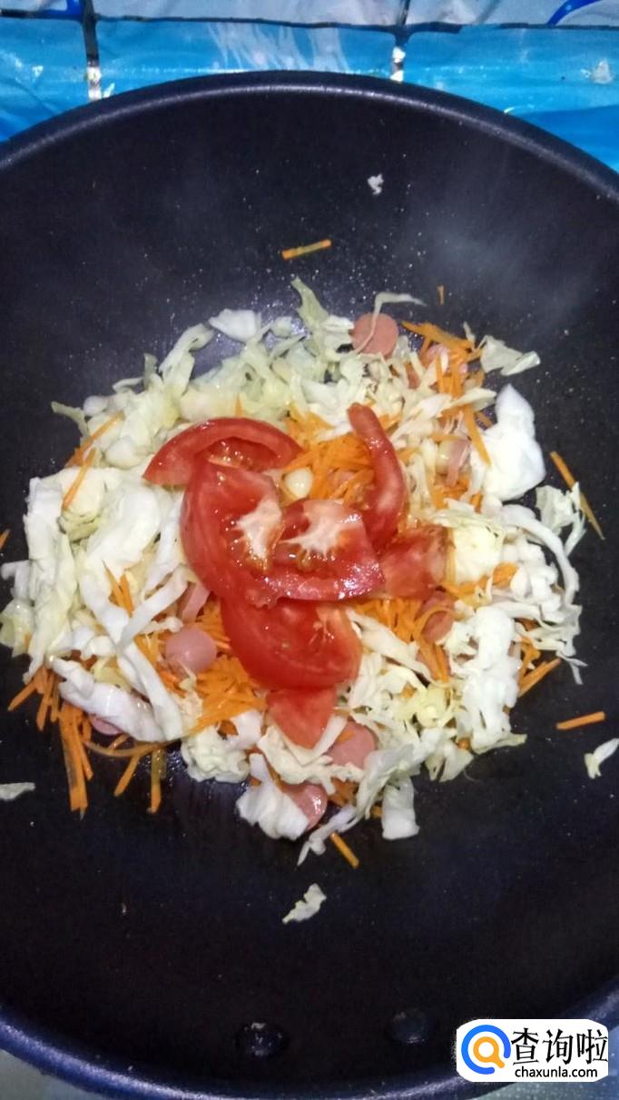 加入适量胡萝卜丝,再加入适量包菜丝,最后将西红柿也倒入锅中,和包菜丝,胡萝卜丝一起翻炒。