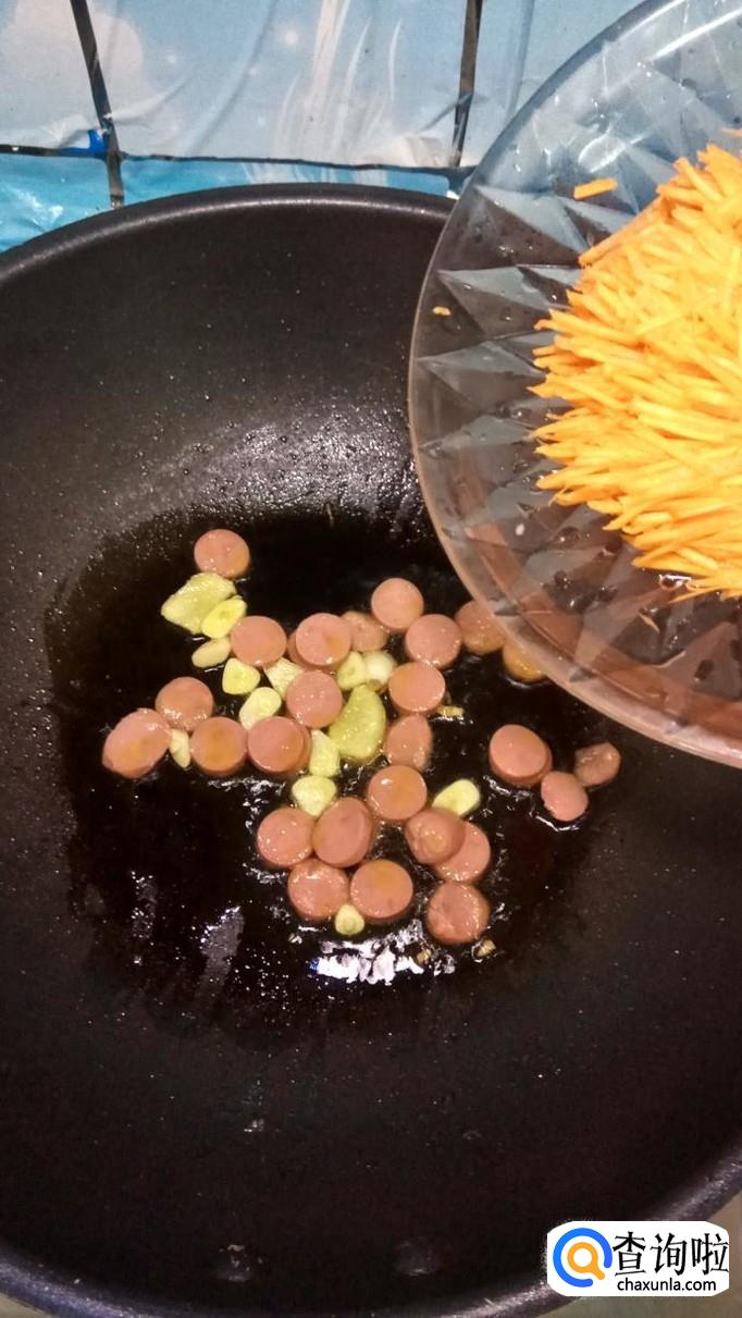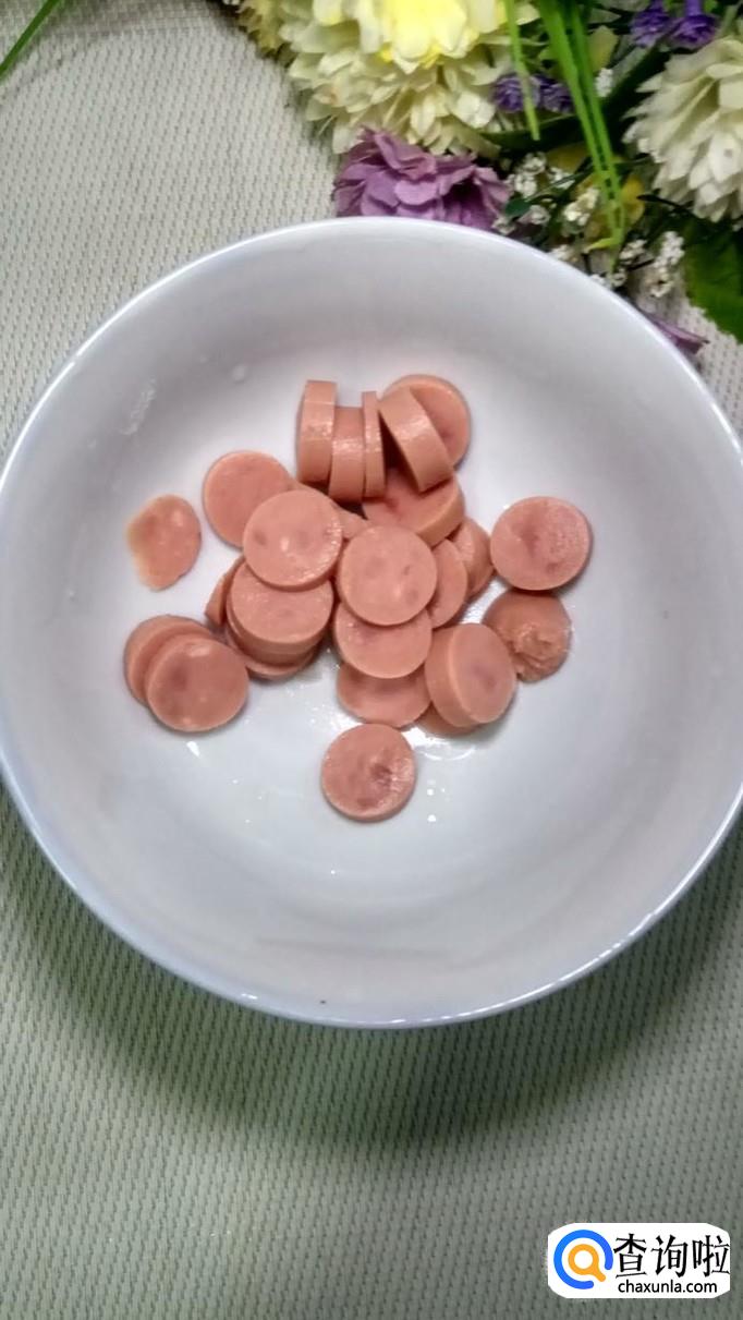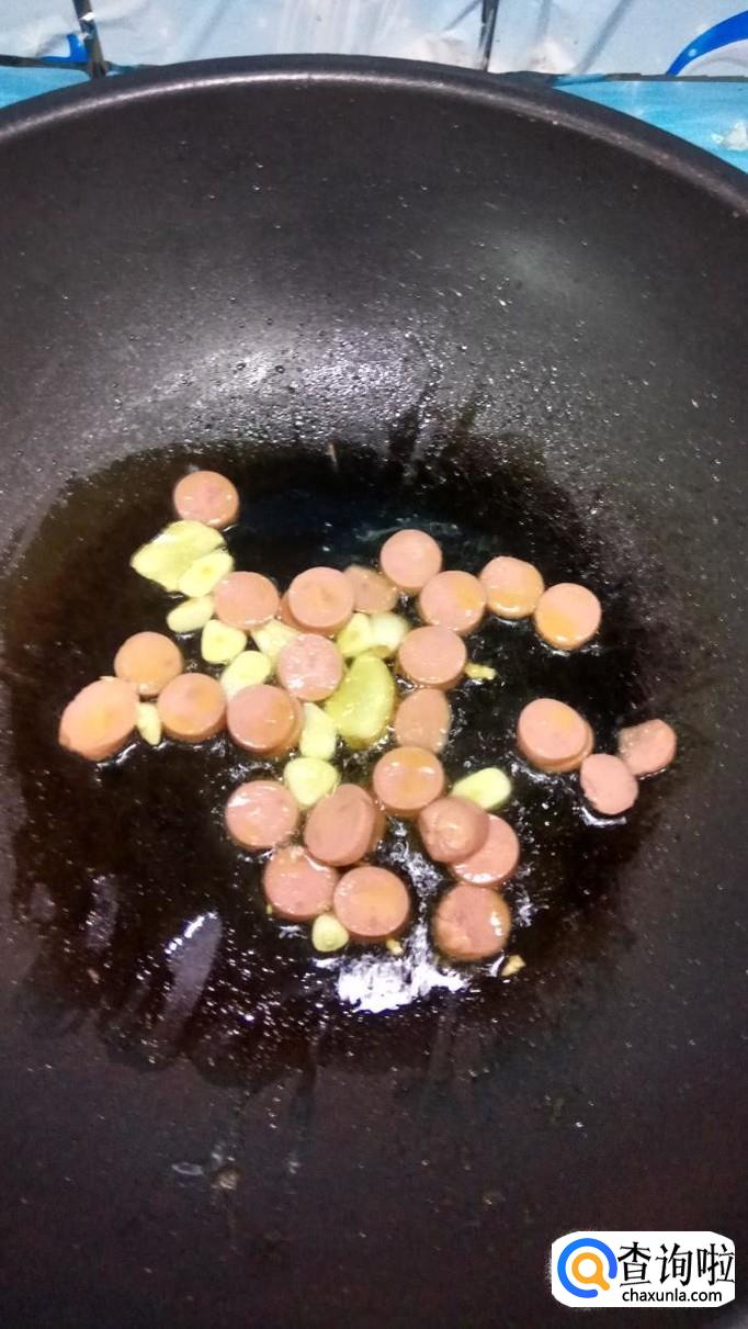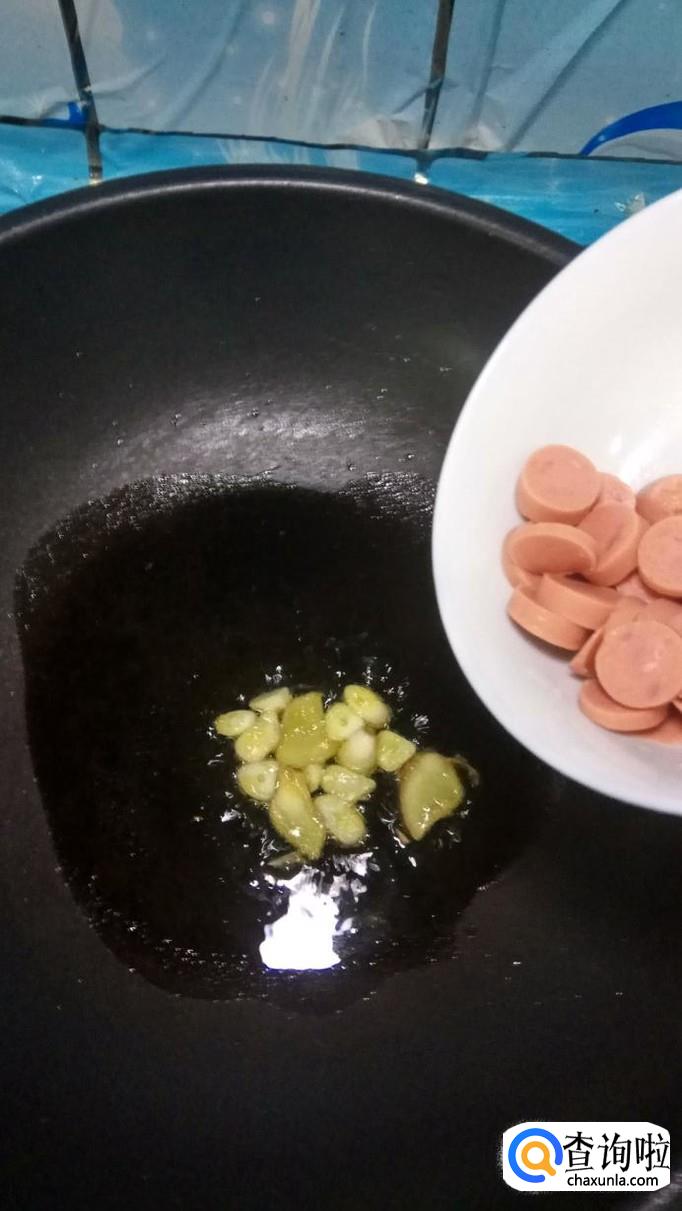 准备一个人火腿肠,去除外衣,切成片儿,炒锅中放入适量油,油热后放入蒜片爆香,再将准备好的火腿肠片放入锅中,炒至变色。