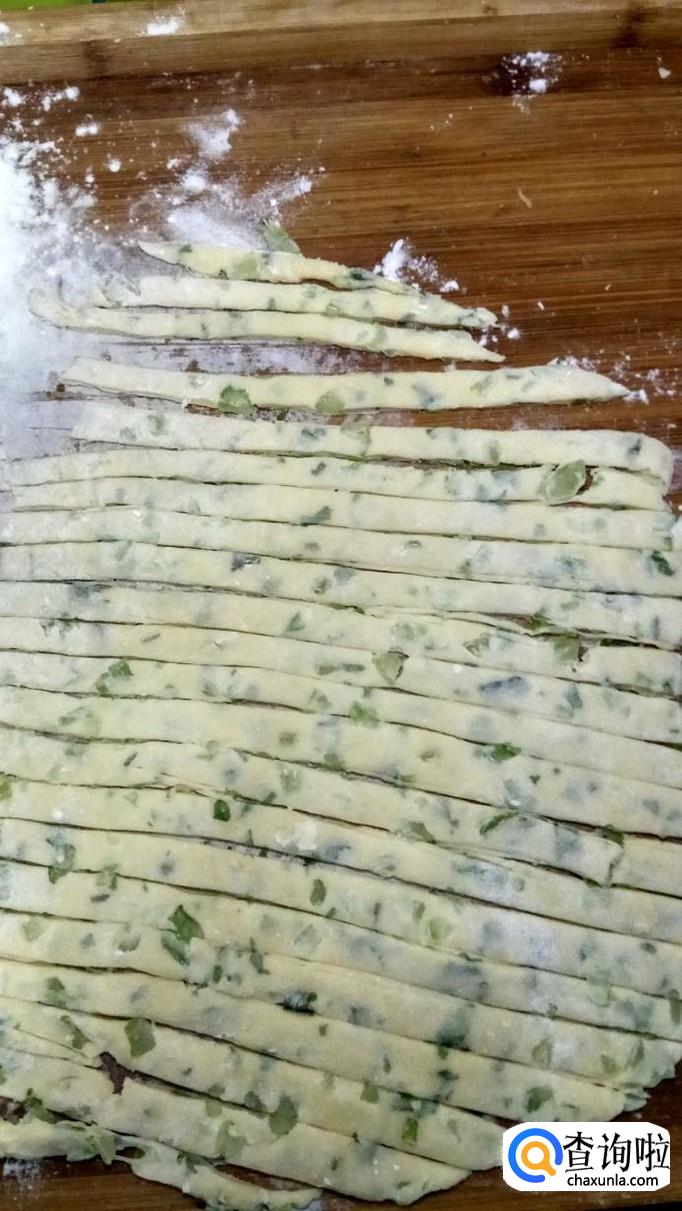 加入适量的清水,和成面团,醒15分钟,这样面条更加筋道。然后将面团儿,擀成薄片,尽量擀薄一些,然后用刀劈成面条备用。