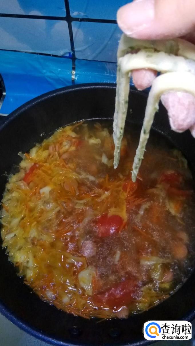 加入两大碗清水,大火将水烧开,将之前做好的芹菜面条放入锅中煮一下。