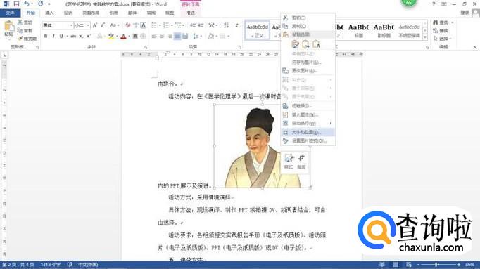 如果版本不一样,可能没有没有第一种方法中的图标,那么就使用我们的第二种方法。在图片上单击右键,选择大小和位置。