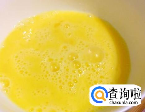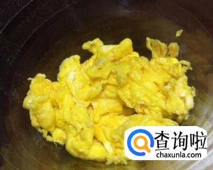 先炒鸡蛋,锅中放入食用油,油热后,将鸡蛋液倒入锅中,用铲子搅拌成均匀的小块,然后盛入盘中待用。